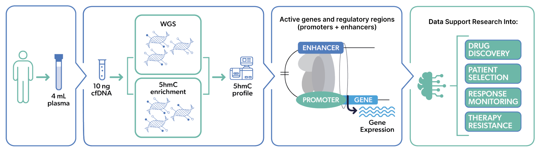 The Virtuoso workflow is outlined in Figure 1. Whole blood is drawn from the subject using a standard phlebotomy procedure. Cell-free DNA (cfDNA) is then isolated from blood plasma. The cfDNA enters a whole genome sequencing workflow, including an innovative 5hmC-DNA enrichment process. The test directly measures active and relevant biological events by evaluating 5hmC-DNA profiles, copy number variations (CNVs), and cfDNA fragment sizes. A proprietary machine learning algorithm uses these features to identify relevant genomic features. Measuring active disease biology empowers oncology drug discovery and development by offering dynamic insights into drug response and resistance.